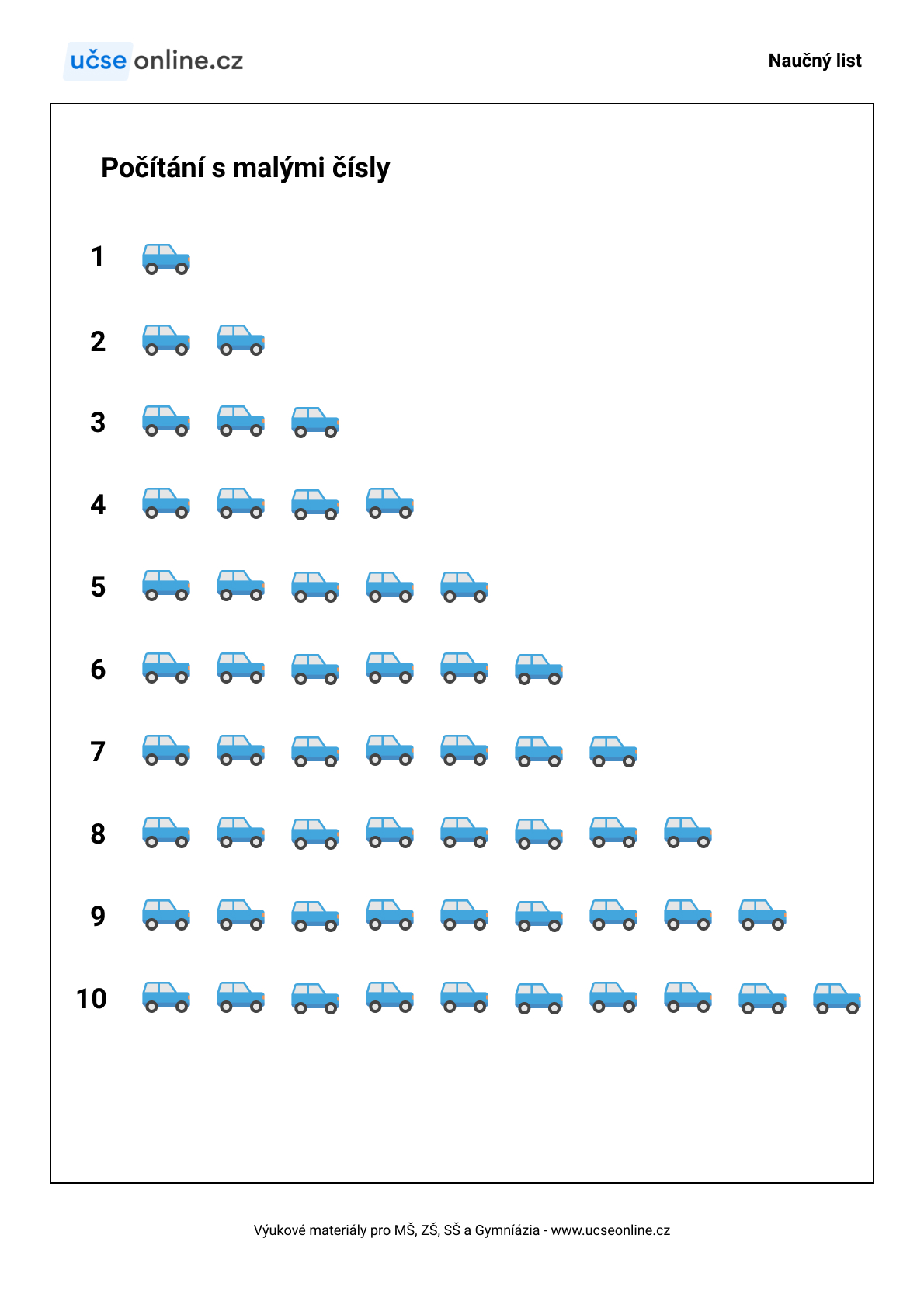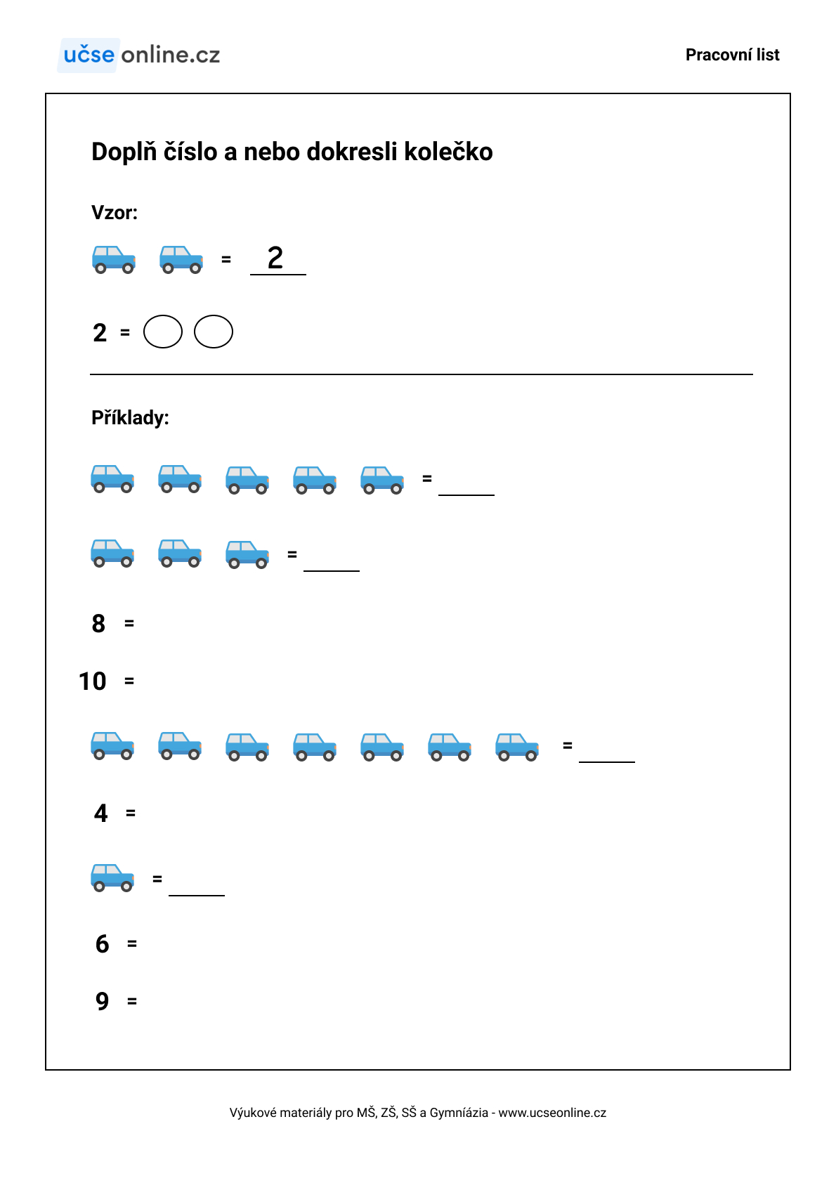 Připravili jsme naučný list, kde si děti mohou číslo představit jako předmět – v našem případě autíčko a k tomu i pracovní list, kde si to mohou vyzkoušet pochopit v praxi.